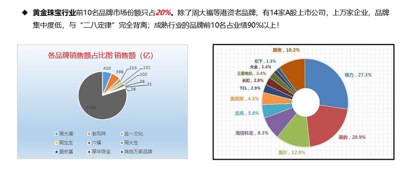 品牌集中度低,機會多。u黃金珠寶行業(yè)前10名品牌市場份額只占20%。除了周大福等港資老品牌,有14家A股上市公司,上萬家企業(yè),品牌集中度低,與“二八定律”完全背離;成熟行業(yè)的品牌前10名占業(yè)績90%以上!