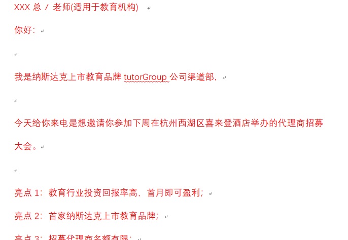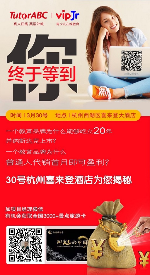 iTutorGroup在線教育集團于2001年創(chuàng)立,是全球最大的教育集團,布局全世界80多個國家,擁有5000多位員工、超過20000名外籍顧問,每年提供3000萬堂在線課程。ITutorGroup在全國各大城市召開代銷會,主推vipJr在線青少兒教育以及TutorABC成人在線英語。iTutorGroup在線教育集團中國公司找到贏想力合作,為每次的代銷會議邀約高質量的潛在投資者到場。