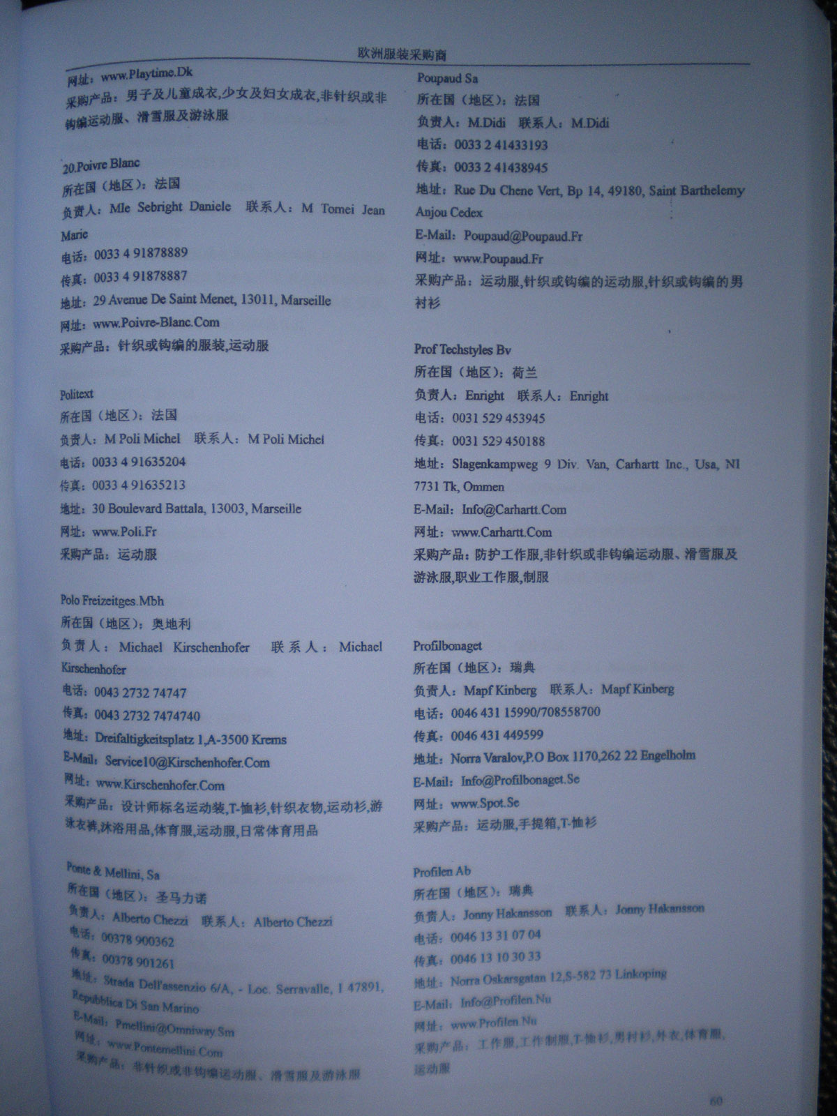 資料如何收集:在各大展會上,我們免費向到會采購商提供他們需要的最新產品雜志和光盤,我們也同時向他們派發(fā)帶有我們網(wǎng)站LOGO的精美禮品,這些最新的中國供應商的信息,對他們很有幫助,采購商會留下他們的名片,填寫詳細的產品求購信息,以期望得到更多的供應商的信息。收集到這些第一手的原始外商資料后,我們客戶服務中心立刻將名片掃描作成圖片,將產品采購信息做成數(shù)據(jù)庫,將采購商資料按行業(yè)不同,匯編成冊,出版發(fā)行《全球采購商黃頁》系列。