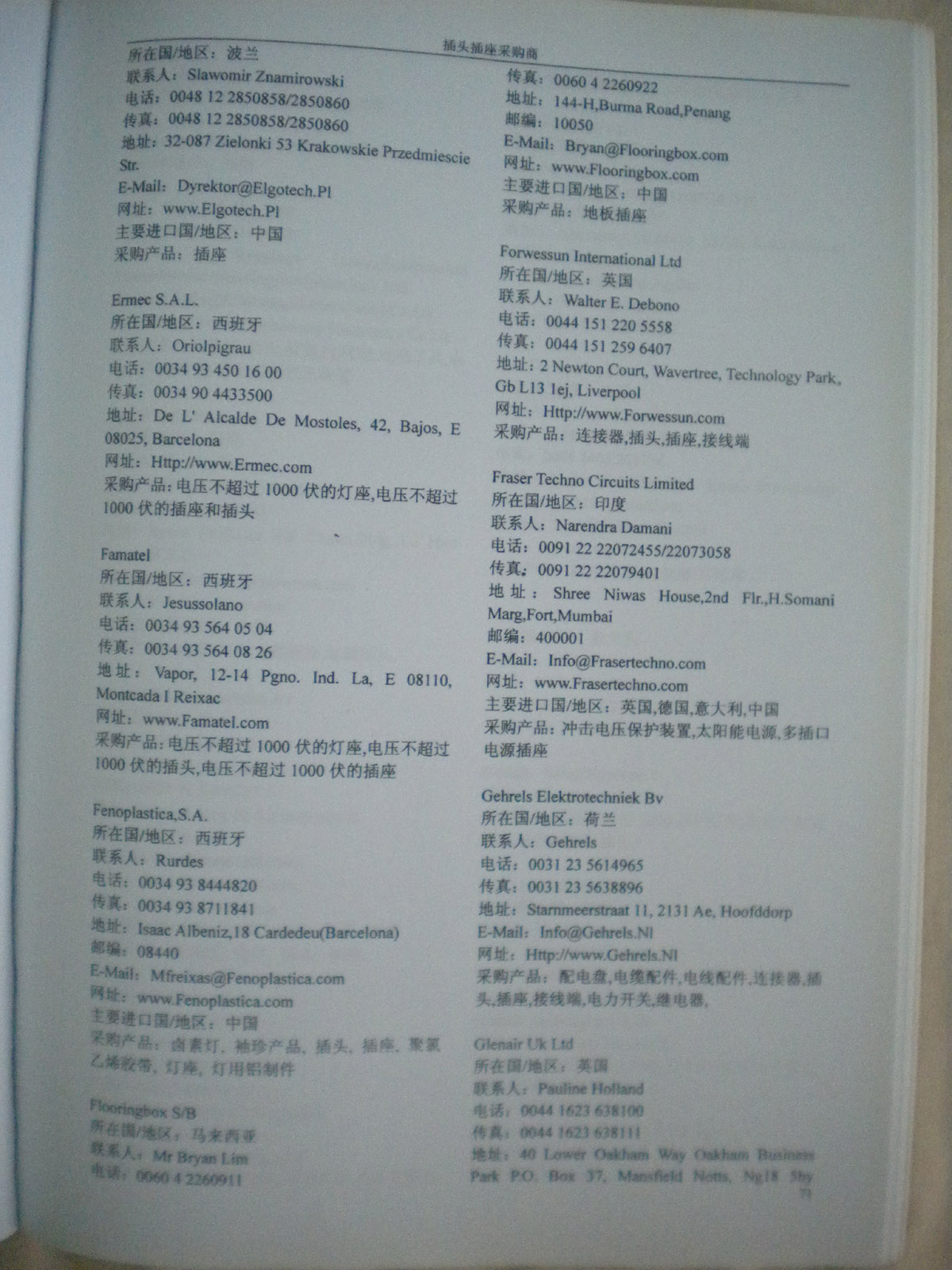 書(shū)刊簡(jiǎn)介:《全球采商黃頁(yè)》系列叢書(shū)是由全球最活躍的專(zhuān)業(yè)買(mǎi)家及重要國(guó)際性展會(huì)的到會(huì)采購(gòu)商名片信息匯編而成,包含三十多個(gè)行業(yè)分類(lèi),匯集了各類(lèi)產(chǎn)品的買(mǎi)家信息。其中收錄的每家采購(gòu)商信息均是我們通過(guò)與買(mǎi)家面對(duì)面的登記整理收集而成,采購(gòu)意向明確,針對(duì)性強(qiáng)。為了確保信息的準(zhǔn)確性和時(shí)效性,我們定期進(jìn)行跟進(jìn)、回訪、補(bǔ)充及更新工作。每家采購(gòu)商信息包括國(guó)別、公司名稱(chēng)、聯(lián)系人、地址、電話、傳真、電郵、網(wǎng)址、采購(gòu)產(chǎn)品等詳細(xì)內(nèi)容,每?jī)?cè)《黃頁(yè)》約有兩千家左右的采購(gòu)商信息。在當(dāng)前國(guó)際出口形勢(shì)日趨嚴(yán)峻的環(huán)境下,如何降低成本開(kāi)拓國(guó)際市場(chǎng),是每個(gè)出口企業(yè)急需尋找的答案,我們相信通過(guò)我們10多年的外貿(mào)信息服務(wù)經(jīng)驗(yàn)和最新的國(guó)際買(mǎi)家資源服務(wù),將會(huì)為您拓展全球市場(chǎng)提供最直接有效的幫助。專(zhuān)業(yè)對(duì)口的買(mǎi)家信息一定會(huì)幫助貴公司打開(kāi)更廣闊的外貿(mào)市場(chǎng)!