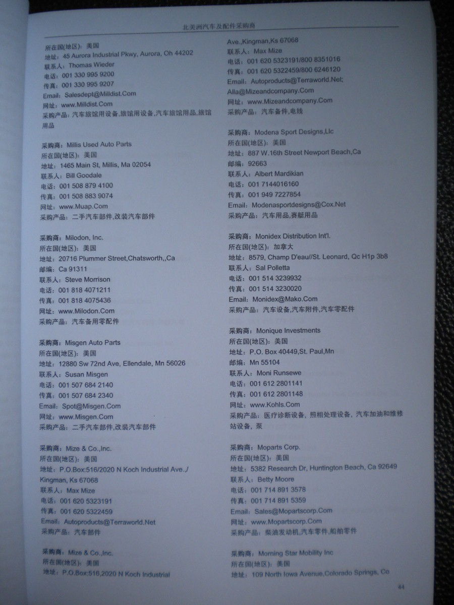 資料如何收集:在各大展會上,我們免費向到會采購商提供他們需要的最新產(chǎn)品雜志和光盤,我們也同時向他們派發(fā)帶有我們網(wǎng)站LOGO的精美禮品,這些最新的中國供應商的信息,對他們很有幫助,采購商會留下他們的名片,填寫詳細的產(chǎn)品求購信息,以期望得到更多的供應商的信息。收集到這些第一手的原始外商資料后,我們客戶服務中心立刻將名片掃描作成圖片,將產(chǎn)品采購信息做成數(shù)據(jù)庫,將采購商資料按行業(yè)不同,匯編成冊,出版發(fā)行《全球采購商黃頁》系列。