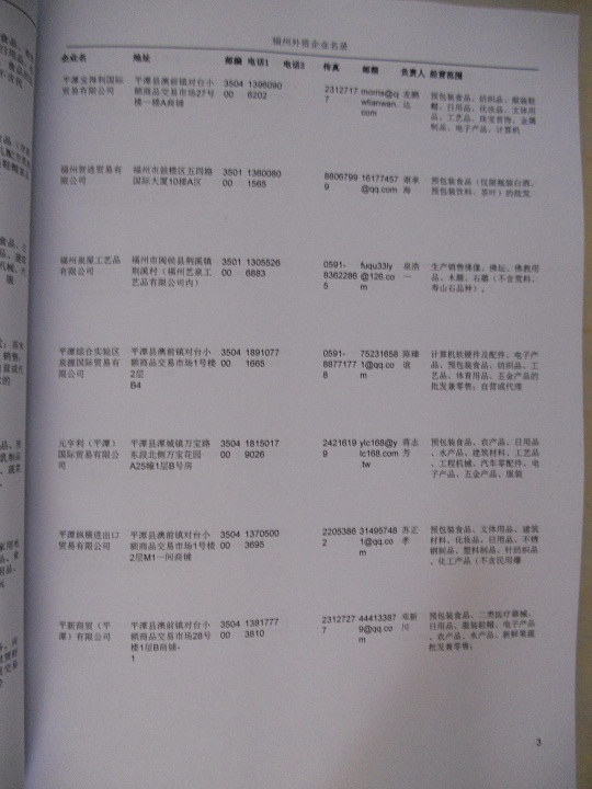最新福州外資企業(yè)黃頁涵蓋了福州外商獨(dú)資企業(yè)、中外合資經(jīng)營(yíng)企業(yè)以及港、澳、臺(tái)資企業(yè),包括福州臺(tái)資日資企業(yè)黃頁,福州外企黃頁具體內(nèi)容包括:企業(yè)名稱、地址、電話、傳真、郵箱、經(jīng)營(yíng)范圍、注冊(cè)資金等信息;福州外資企業(yè)名單里面的企業(yè)都一些中外合資的大企業(yè),這些公司經(jīng)濟(jì)實(shí)力都比較雄厚,出口產(chǎn)品也比較多,業(yè)務(wù)范圍都比較廣,跟他們開展業(yè)務(wù)往來都比較容易;有了福州臺(tái)企日企黃頁開展業(yè)務(wù)也有了針對(duì)性,也省去了盲目去尋找客戶名單而浪費(fèi)的時(shí)間了,工作效率也會(huì)有很大的提高.歡迎需要的客戶及時(shí)聯(lián)系我們!