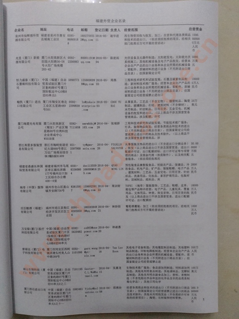最新福建外資企業(yè)黃頁涵蓋了福建外商獨資企業(yè)、中外合資經(jīng)營企業(yè)以及港、澳、臺資企業(yè),包括福建日資臺資企業(yè)黃頁,福建外企黃頁具體內(nèi)容包括:企業(yè)名稱、地址、電話、傳真、郵箱、經(jīng)營范圍、注冊資金等信息;福建外資企業(yè)名單里面的企業(yè)都一些中外合資的大企業(yè),這些公司經(jīng)濟實力都比較雄厚,出口產(chǎn)品也比較多,業(yè)務(wù)范圍都比較廣,跟他們開展業(yè)務(wù)往來都比較容易;有了福建日企臺企黃頁開展業(yè)務(wù)也有了針對性,也省去了盲目去尋找客戶名單而浪費的時間了,工作效率也會有很大的提高.歡迎需要的客戶及時聯(lián)系我們!