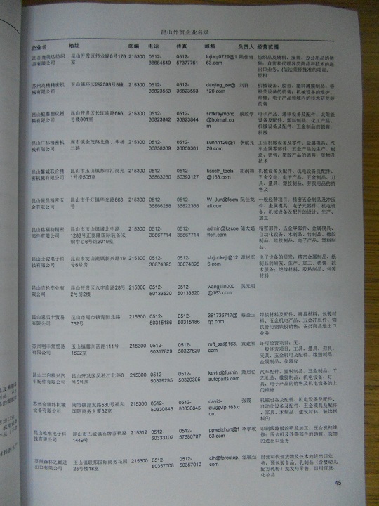 昆山外貿(mào)企業(yè)黃頁(yè)包括:外貿(mào)企業(yè)名稱、地址、電話、傳真、郵箱、經(jīng)營(yíng)范圍、注冊(cè)資金等信息。