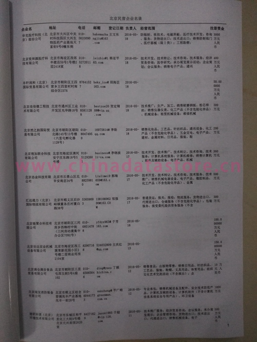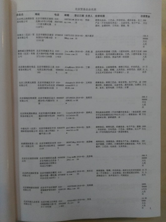 2021版最新北京企業(yè)黃頁(yè)包括《北京制造企業(yè)黃頁(yè)》、《北京貿(mào)易企業(yè)黃頁(yè)》、《北京民營(yíng)企業(yè)黃頁(yè)》、《北京外資企業(yè)黃頁(yè)》、《北京外貿(mào)企業(yè)黃頁(yè)》共五冊(cè),現(xiàn)優(yōu)惠價(jià):280元/冊(cè)。每?jī)?cè)內(nèi)容包括:?jiǎn)挝幻Q(chēng)、地址、郵編、電話、傳真、郵箱、經(jīng)營(yíng)范圍等;北京企業(yè)黃頁(yè)涵蓋了近幾年來(lái)最新成立的、有一定規(guī)模的企業(yè),具有非常高的營(yíng)銷(xiāo)價(jià)值。有了這套黃頁(yè)開(kāi)展業(yè)務(wù)也有了針對(duì)性,也省去了盲目去尋找客戶名單而浪費(fèi)的時(shí)間了,工作效率也會(huì)有很大的提高。歡迎需要北京企業(yè)黃頁(yè)的朋友及時(shí)聯(lián)系我們!