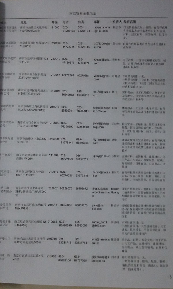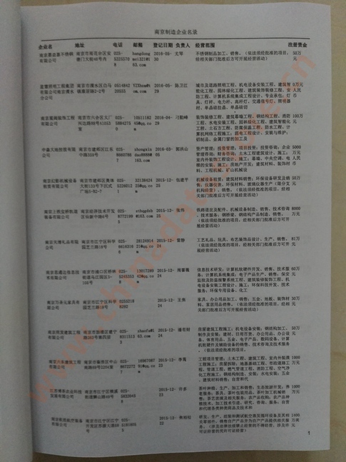 2021版最新南京企業(yè)黃頁包括《南京制造企業(yè)黃頁》、《南京貿(mào)易企業(yè)黃頁》、《南京民營企業(yè)黃頁》、《南京外資企業(yè)黃頁》、《南京外貿(mào)企業(yè)黃頁》共五冊(cè),現(xiàn)優(yōu)惠價(jià):280元/冊(cè)。每冊(cè)內(nèi)容包括:單位名稱、地址、郵編、電話、傳真、郵箱、經(jīng)營范圍等;南京企業(yè)黃頁涵蓋了近幾年來最新成立的、有一定規(guī)模的企業(yè),具有非常高的營銷價(jià)值。有了這套黃頁開展業(yè)務(wù)也有了針對(duì)性,也省去了盲目去尋找客戶名單而浪費(fèi)的時(shí)間了,工作效率也會(huì)有很大的提高。歡迎需要南京企業(yè)黃頁的朋友及時(shí)聯(lián)系我們!