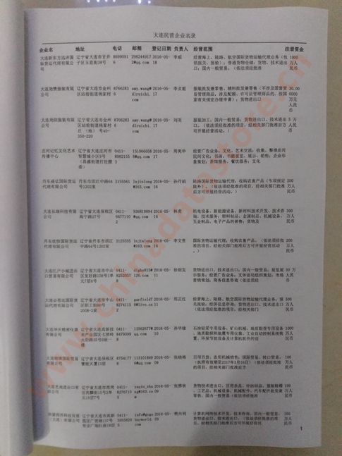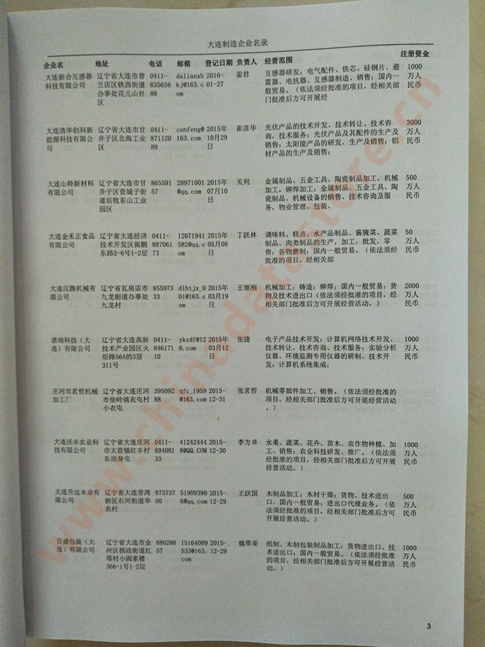 2021版最新大連企業(yè)黃頁包括《大連制造企業(yè)黃頁》、《大連貿(mào)易企業(yè)黃頁》、《大連民營企業(yè)黃頁》、《大連外資企業(yè)黃頁》、《大連外貿(mào)企業(yè)黃頁》共五冊(cè),現(xiàn)優(yōu)惠價(jià):280元/冊(cè)。每冊(cè)內(nèi)容包括:單位名稱、地址、郵編、電話、傳真、郵箱、經(jīng)營范圍等;大連企業(yè)黃頁涵蓋了近幾年來最新成立的、有一定規(guī)模的企業(yè),具有非常高的營銷價(jià)值。有了這套黃頁開展業(yè)務(wù)也有了針對(duì)性,也省去了盲目去尋找客戶名單而浪費(fèi)的時(shí)間了,工作效率也會(huì)有很大的提高。歡迎需要大連企業(yè)黃頁的朋友及時(shí)聯(lián)系我們!