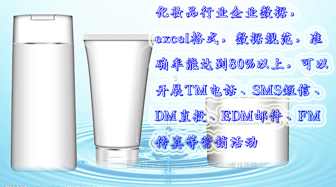 最新化妝品生產(chǎn)與貿(mào)易企業(yè)黃頁數(shù)據(jù)更新日期2024年12月最新,全國化妝品企業(yè)黃頁共66000條,都是具有一定規(guī)模的化妝品行業(yè)的注冊實體企業(yè),數(shù)據(jù)準確率高,是您開展各項營銷活動的必備資料。企業(yè)名單包括:企業(yè)名稱、地址、電話(以上必有,以下選有)、傳真、郵箱、登記日期、經(jīng)營范圍、注冊資金等信息?;瘖y品企業(yè)黃頁數(shù)據(jù)為Excel格式,信息可任意修改、復(fù)制、打印、導(dǎo)出及導(dǎo)入到傳真、郵件群發(fā)等軟件中,無任何限制。