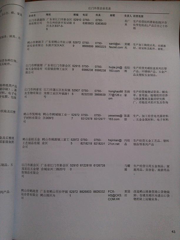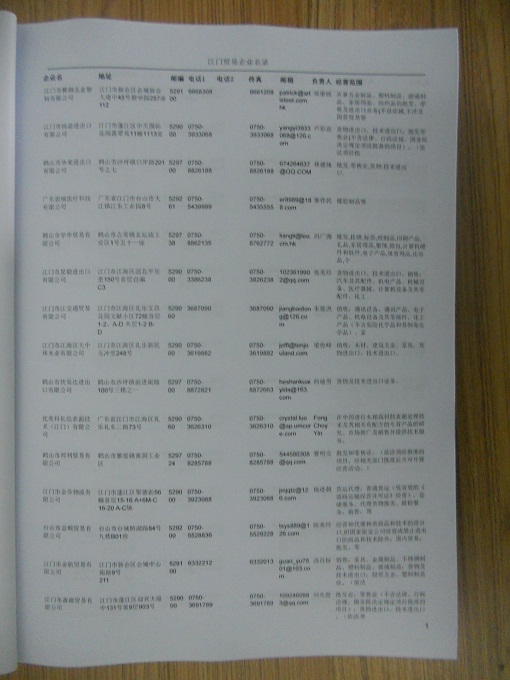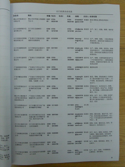2021版最新江門企業(yè)黃頁包括《江門制造企業(yè)黃頁》、《江門貿(mào)易企業(yè)黃頁》、《江門民營企業(yè)黃頁》、《江門外資企業(yè)黃頁》、《江門外貿(mào)企業(yè)黃頁》共五冊,現(xiàn)優(yōu)惠價:280元/冊。每冊內(nèi)容包括:單位名稱、地址、郵編、電話、傳真、郵箱、經(jīng)營范圍等;江門企業(yè)黃頁涵蓋了近幾年來最新成立的、有一定規(guī)模的企業(yè),具有非常高的營銷價值。有了這套黃頁開展業(yè)務也有了針對性,也省去了盲目去尋找客戶名單而浪費的時間了,工作效率也會有很大的提高。歡迎需要江門企業(yè)黃頁的朋友及時聯(lián)系我們!