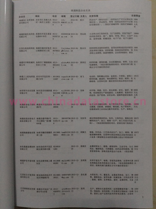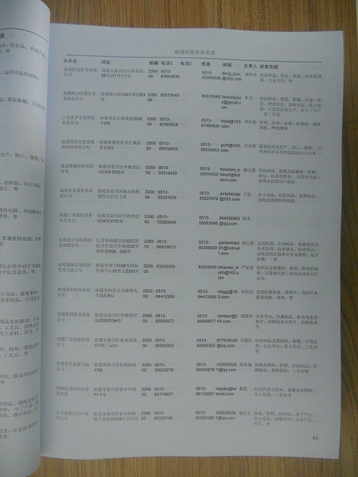2021版最新南通企業(yè)黃頁(yè)包括《南通制造企業(yè)黃頁(yè)》、《南通貿(mào)易企業(yè)黃頁(yè)》、《南通民營(yíng)企業(yè)黃頁(yè)》、《南通外資企業(yè)黃頁(yè)》、《南通外貿(mào)企業(yè)黃頁(yè)》共五冊(cè),現(xiàn)優(yōu)惠價(jià):280元/冊(cè)。每?jī)?cè)內(nèi)容包括:?jiǎn)挝幻Q、地址、郵編、電話、傳真、郵箱、經(jīng)營(yíng)范圍等;南通企業(yè)黃頁(yè)涵蓋了近幾年來(lái)最新成立的、有一定規(guī)模的企業(yè),具有非常高的營(yíng)銷價(jià)值。有了這套黃頁(yè)開(kāi)展業(yè)務(wù)也有了針對(duì)性,也省去了盲目去尋找客戶名單而浪費(fèi)的時(shí)間了,工作效率也會(huì)有很大的提高。歡迎需要南通企業(yè)黃頁(yè)的朋友及時(shí)聯(lián)系我們!