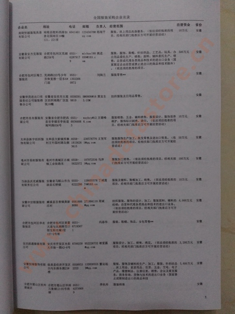 2024年新版中國服裝采購企業(yè)黃頁,收錄了全國各地經(jīng)營范圍涉及服裝產(chǎn)品的貿(mào)易企業(yè),這些都是頗具實力的服裝產(chǎn)品的中國采購商。黃頁內(nèi)容包含:企業(yè)名稱、地址、電話、傳真、郵箱、經(jīng)營范圍、省份、注冊資金等信息。該套黃頁包含一個黃頁光碟加一冊紙質(zhì)書刊,全國的價格:1500元,省/直轄市價格:400元,城市價格:200元,共收錄了全國各地大概46646(統(tǒng)計日期:2018.1)服裝裝產(chǎn)品采購企業(yè)。黃頁光碟中是EXCEL格式,信息可任意修改、復(fù)制、打印、導(dǎo)出及導(dǎo)入到傳真、郵件群發(fā)等軟件中,無任何限制。