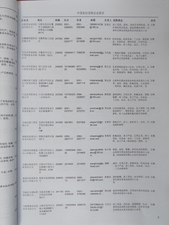 2024年新版中國家紡采購企業(yè)黃頁,收錄了全國各地經(jīng)營范圍涉及家紡產(chǎn)品的貿(mào)易企業(yè),這些都是頗具實(shí)力的家紡產(chǎn)品的中國采購商。黃頁內(nèi)容包含:企業(yè)名稱、地址、電話、傳真、郵箱、經(jīng)營范圍、省份、注冊(cè)資金等信息。該套黃頁包含一個(gè)黃頁光碟加一冊(cè)紙質(zhì)書刊,全國價(jià)格:1500元,省/直轄市價(jià)格:400元元,城市價(jià)格:200元,共收錄了全國各地大概4945398(統(tǒng)計(jì)日期:2018.1)家。黃頁光碟中是EXCEL格式,信息可任意修改、復(fù)制、打印、導(dǎo)出及導(dǎo)入到傳真、郵件群發(fā)等軟件中,無任何限制。