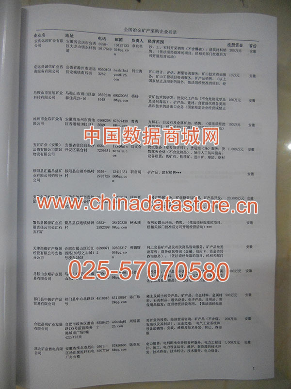 2024年新版中國冶金礦產(chǎn)采購企業(yè)黃頁,收錄了全國各地經(jīng)營范圍涉及冶金礦產(chǎn)產(chǎn)品的貿(mào)易企業(yè),這些都是頗具實(shí)力的冶金礦產(chǎn)產(chǎn)品的中國采購商。黃頁內(nèi)容包含:企業(yè)名稱、地址、電話、傳真、郵箱、經(jīng)營范圍、省份、注冊資金等信息。該套黃頁包含一個(gè)黃頁光碟加一冊紙質(zhì)書刊,全國價(jià)格:1500元,省/直轄市價(jià)格:400元,城市價(jià)格:200元,共收錄了全國各地大概8042(統(tǒng)計(jì)日期:2018.1)家冶金礦產(chǎn)產(chǎn)品采購企業(yè)。黃頁光碟中是EXCEL格式,信息可任意修改、復(fù)制、打印、導(dǎo)出及導(dǎo)入到傳真、郵件群發(fā)等軟件中,無任何限制。