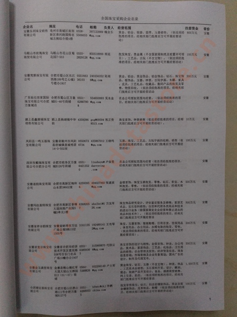 2024年新版中國珠寶采購企業(yè)黃頁,收錄了全國各地經(jīng)營范圍涉及珠寶產(chǎn)品的貿(mào)易企業(yè),這些都是頗具實力的珠寶產(chǎn)品的中國采購商。黃頁內容包含:企業(yè)名稱、地址、電話、傳真、郵箱、經(jīng)營范圍、省份、注冊資金等信息。該套黃頁包含一個黃頁光碟加一冊紙質書刊,全國價格:1500元,省/直轄市價格:400元,城市價格:200元,共收錄了全國各地大概44763(統(tǒng)計日期:2018.1)家珠寶產(chǎn)品采購企業(yè)。黃頁光碟中是EXCEL格式,信息可任意修改、復制、打印、導出及導入到傳真、郵件群發(fā)等軟件中,無任何限制。