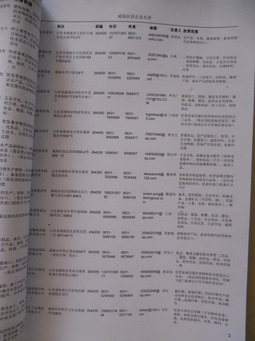 2021版最新威海企業(yè)黃頁包括《威海制造企業(yè)黃頁》、《威海民營企業(yè)黃頁》,現(xiàn)優(yōu)惠價:280元/冊。每冊內(nèi)容包括:單位名稱、地址、郵編、電話、傳真、郵箱、經(jīng)營范圍等;威海企業(yè)黃頁涵蓋了近幾年來最新成立的、有一定規(guī)模的企業(yè),具有非常高的營銷價值。有了這套黃頁開展業(yè)務(wù)也有了針對性,也省去了盲目去尋找客戶名單而浪費的時間了,工作效率也會有很大的提高。歡迎需要威海企業(yè)黃頁的朋友及時聯(lián)系我們!