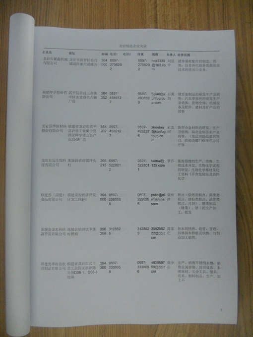 2021版最新龍巖企業(yè)黃頁(yè)包括《龍巖制造企業(yè)黃頁(yè)》、《龍巖民營(yíng)企業(yè)黃頁(yè)》,現(xiàn)優(yōu)惠價(jià):280元/冊(cè)。每?jī)?cè)內(nèi)容包括:?jiǎn)挝幻Q、地址、郵編、電話、傳真、郵箱、經(jīng)營(yíng)范圍等;龍巖企業(yè)黃頁(yè)涵蓋了近幾年來最新成立的、有一定規(guī)模的企業(yè),具有非常高的營(yíng)銷價(jià)值。有了這套黃頁(yè)開展業(yè)務(wù)也有了針對(duì)性,也省去了盲目去尋找客戶名單而浪費(fèi)的時(shí)間了,工作效率也會(huì)有很大的提高。歡迎需要龍巖企業(yè)黃頁(yè)的朋友及時(shí)聯(lián)系我們!