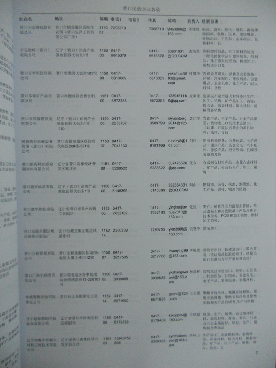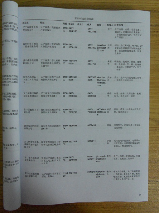 2021版最新營口企業(yè)黃頁包括《營口制造企業(yè)黃頁》、《營口民營企業(yè)黃頁》,現(xiàn)優(yōu)惠價(jià):280元/冊。每冊內(nèi)容包括:單位名稱、地址、郵編、電話、傳真、郵箱、經(jīng)營范圍等;營口企業(yè)黃頁涵蓋了近幾年來最新成立的、有一定規(guī)模的企業(yè),具有非常高的營銷價(jià)值。有了這套黃頁開展業(yè)務(wù)也有了針對性,也省去了盲目去尋找客戶名單而浪費(fèi)的時間了,工作效率也會有很大的提高。歡迎需要營口企業(yè)黃頁的朋友及時聯(lián)系我們!