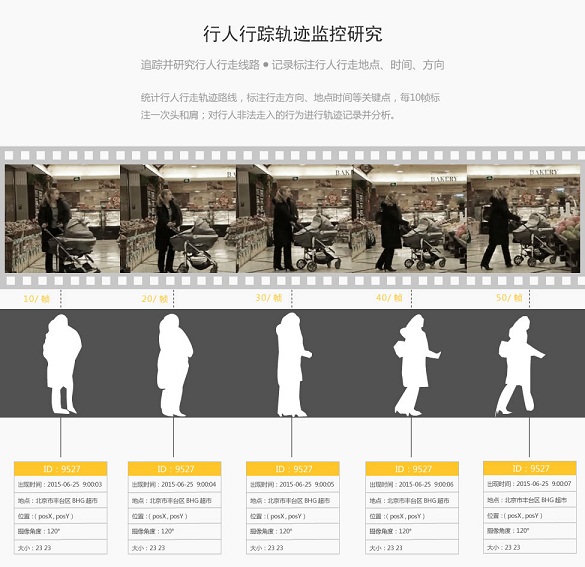 采集行人對(duì)象跟蹤視頻,有效時(shí)長(zhǎng)1.8小時(shí),每10幀標(biāo)注一幅,用于安防監(jiān)控、入侵檢測(cè)、運(yùn)動(dòng)目標(biāo)識(shí)別等