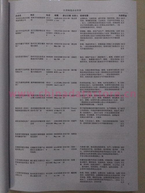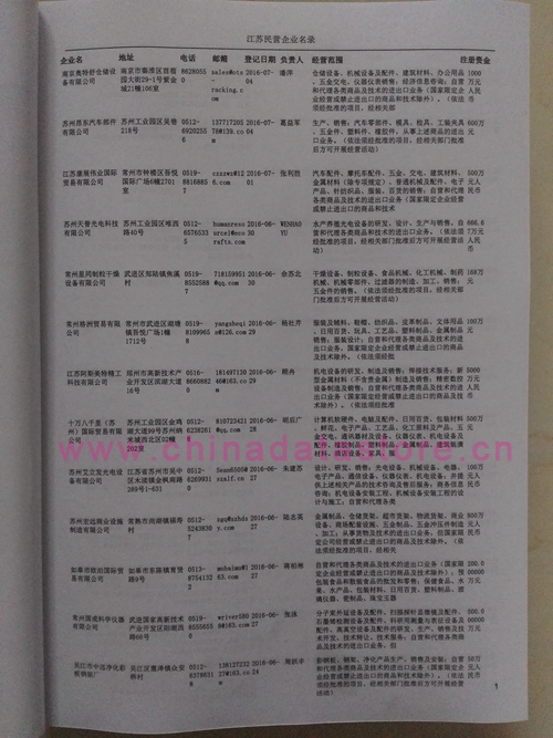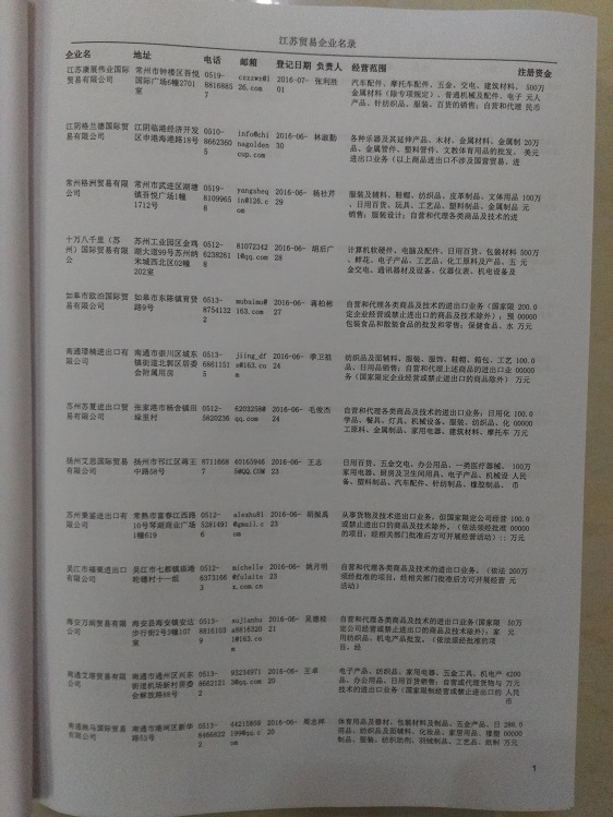 2021版最新江蘇企業(yè)黃頁包括《江蘇制造企業(yè)黃頁》、《江蘇貿(mào)易企業(yè)黃頁》、《江蘇民營企業(yè)黃頁》共三冊,優(yōu)惠價(jià):280元/冊。每冊內(nèi)容包括:單位名稱、地址、郵編、電話、傳真、郵箱、經(jīng)營范圍等;江蘇企業(yè)黃頁涵蓋了近幾年來最新成立的、有一定規(guī)模的企業(yè),具有非常高的營銷價(jià)值。有了這套黃頁開展業(yè)務(wù)也有了針對性,也省去了盲目去尋找客戶名單而浪費(fèi)的時(shí)間了,工作效率也會(huì)有很大的提高。歡迎需要江蘇企業(yè)黃頁的朋友及時(shí)聯(lián)系我們!