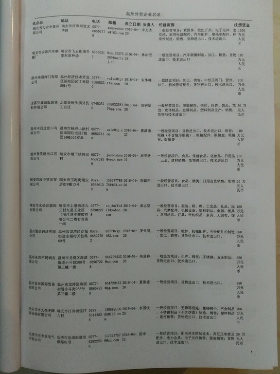 溫州外貿(mào)企業(yè)黃頁包括:外貿(mào)企業(yè)名稱、地址、電話、傳真、郵箱、經(jīng)營范圍、注冊資金等信息。