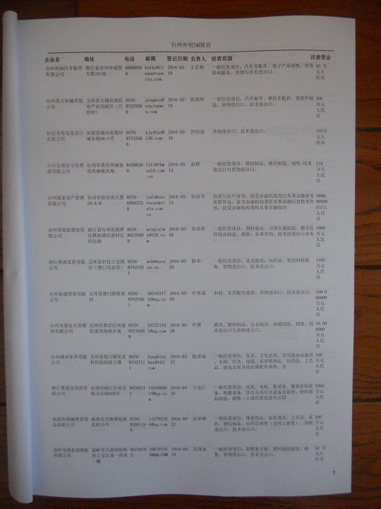 臺(tái)州外貿(mào)企業(yè)黃頁(yè)包括:外貿(mào)企業(yè)名稱、地址、電話、傳真、郵箱、經(jīng)營(yíng)范圍、注冊(cè)資金等信息。