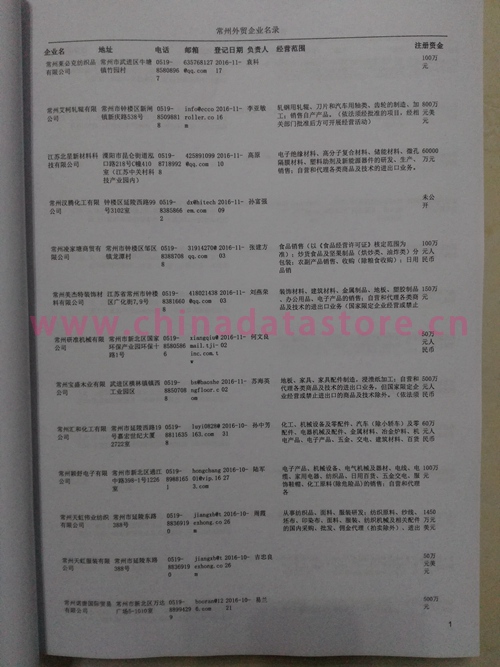 常州外貿(mào)企業(yè)黃頁包括:外貿(mào)企業(yè)名稱、地址、電話、傳真、郵箱、經(jīng)營(yíng)范圍、注冊(cè)資金等信息。