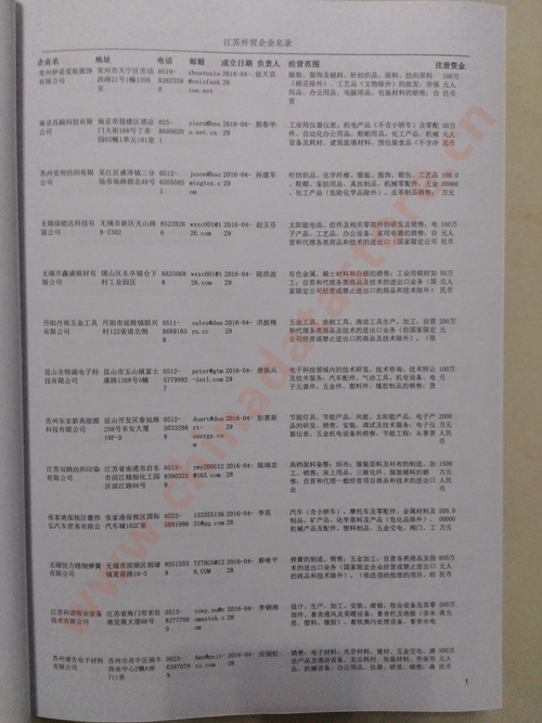 江蘇外貿(mào)企業(yè)黃頁包括:外貿(mào)企業(yè)名稱、地址、電話、傳真、郵箱、經(jīng)營范圍、注冊資金等信息。