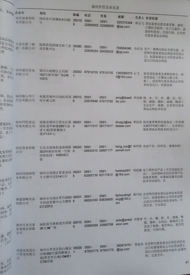 福州外貿企業(yè)黃頁包括:外貿企業(yè)名稱、地址、電話、傳真、郵箱、經營范圍、注冊資金等信息。