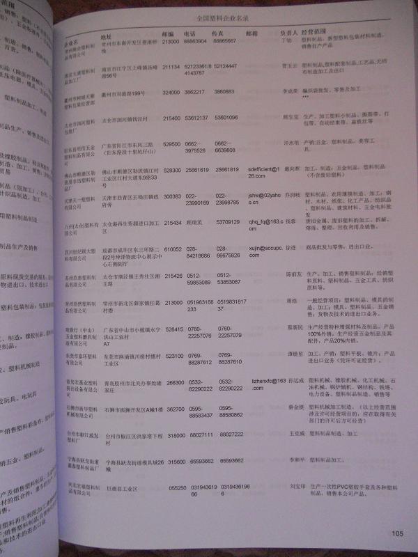 塑料制品外貿(mào)企業(yè)黃頁(yè)包括:外貿(mào)企業(yè)名稱(chēng)、地址、電話(huà)、傳真、郵箱、經(jīng)營(yíng)范圍、注冊(cè)資金等信息。