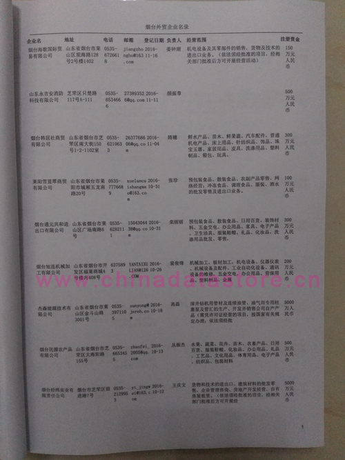 煙臺(tái)外貿(mào)企業(yè)黃頁包括:外貿(mào)企業(yè)名稱、地址、電話、傳真、郵箱、經(jīng)營范圍、注冊資金等信息。