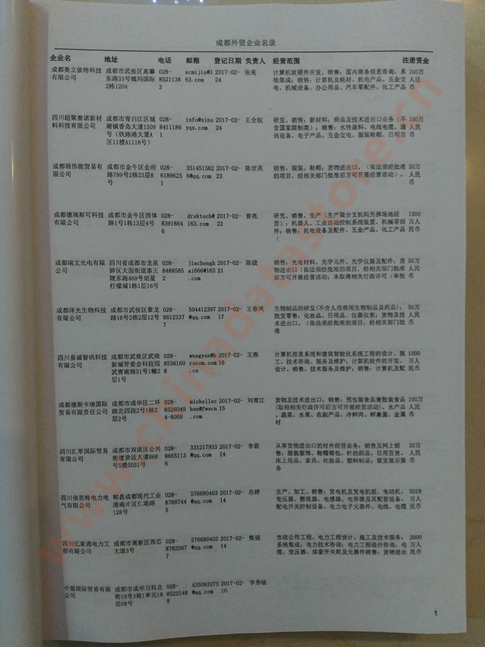 成都外貿企業(yè)黃頁包括:外貿企業(yè)名稱、地址、電話、傳真、郵箱、經(jīng)營范圍、注冊資金等信息。