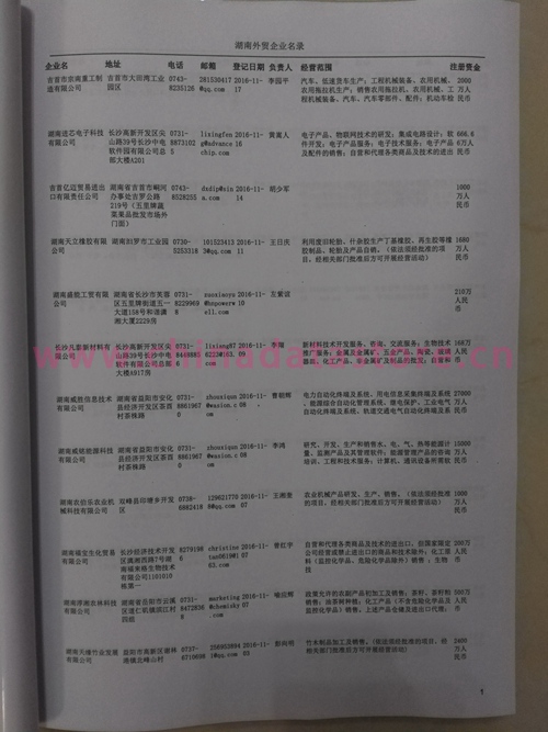 湖南外貿(mào)企業(yè)黃頁包括:外貿(mào)企業(yè)名稱、地址、電話、傳真、郵箱、經(jīng)營范圍、注冊(cè)資金等信息。