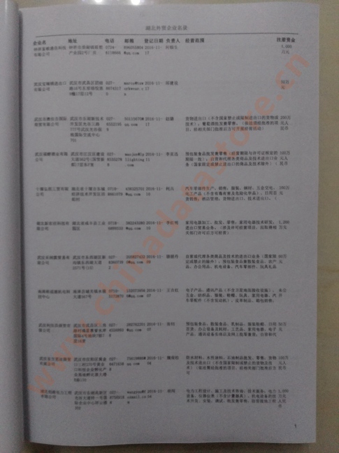 湖北外貿(mào)企業(yè)黃頁(yè)包括:外貿(mào)企業(yè)名稱、地址、電話、傳真、郵箱、經(jīng)營(yíng)范圍、注冊(cè)資金等信息。
