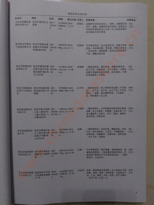 陜西外貿(mào)企業(yè)黃頁包括:外貿(mào)企業(yè)名稱、地址、電話、傳真、郵箱、經(jīng)營范圍、注冊資金等信息。