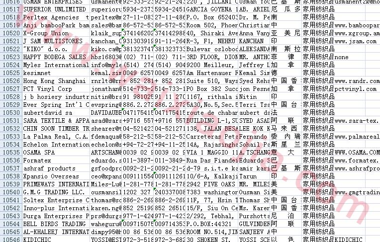 家用紡織品采購商名單數(shù)據(jù)為Excel格式,信息可任意修改、復(fù)制、打印、導(dǎo)出及導(dǎo)入到傳真、郵件群發(fā)等軟件中,無任何限制。