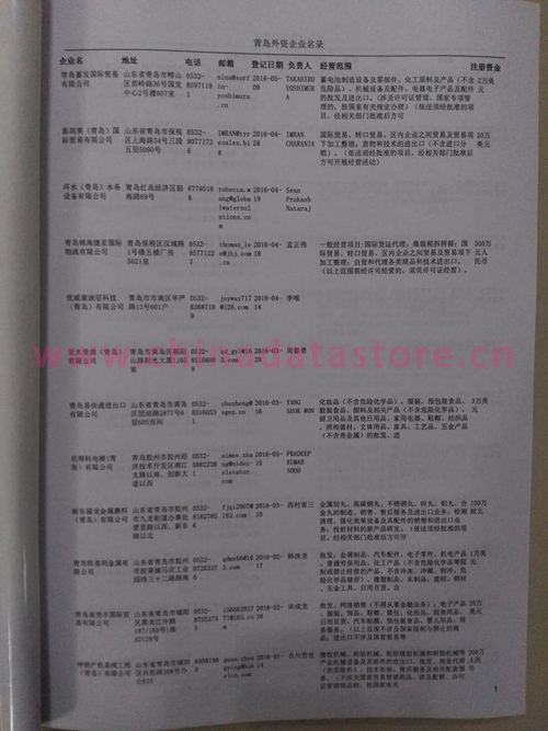 最新青島外資企業(yè)黃頁涵蓋了青島外商獨資企業(yè)、中外合資經營企業(yè)以及港、澳、臺資企業(yè),包括青島臺資日資企業(yè)黃頁,青島外企黃頁具體內容包括:企業(yè)名稱、地址、電話、傳真、郵箱、經營范圍、注冊資金等信息;青島外企黃頁里面的企業(yè)都一些中外合資的大企業(yè),這些公司經濟實力都比較雄厚,出口產品也比較多,業(yè)務范圍都比較廣,跟他們開展業(yè)務往來都比較容易;有了青島日企臺企黃頁開展業(yè)務也有了針對性,也省去了盲目去尋找客戶名單而浪費的時間了,工作效率也會有很大的提高.歡迎需要青島外資公司黃頁的客戶及時聯(lián)系我們!